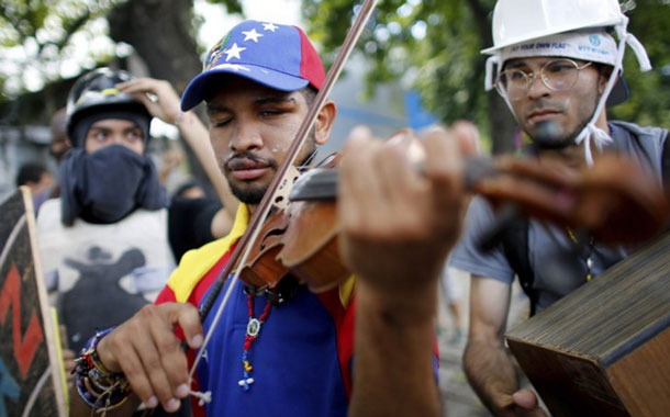 Con sombrías interpretaciones del himno nacional de Venezuela en medio de los gases lacrimógenos y lluvias de balas de goma, el violinista se convirtió en un símbolo del movimiento antigubernamental e incluso fue invitado a Washington para que toque ante el Congreso.